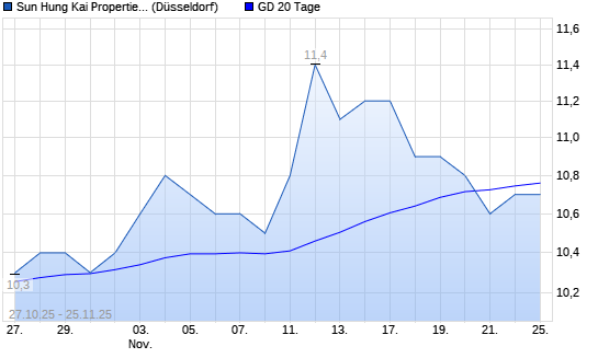 Mit dem Anstieg auf 10,90 EUR hat die Sun Hung Kai Properties-Aktie am 24.11.2025 die 20-Tage-Linie nach oben gekreuzt.Die Sun Hung Kai Properties-Aktie befindet sich seit dem 09.05.2025 im ...weiterlesen