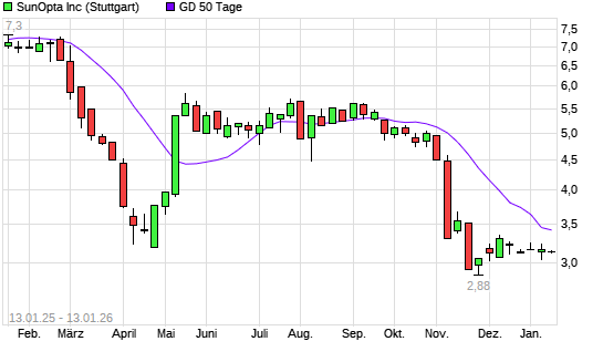 Mit dem Anstieg auf 3,48 EUR hat die SunOpta-Aktie am 12.01.2026 die 50-Tage-Linie nach oben gekreuzt.Die SunOpta-Aktie befindet sich seit dem 28.02.2025 im langfristigen Abwärtstrend und hat ...weiterlesen