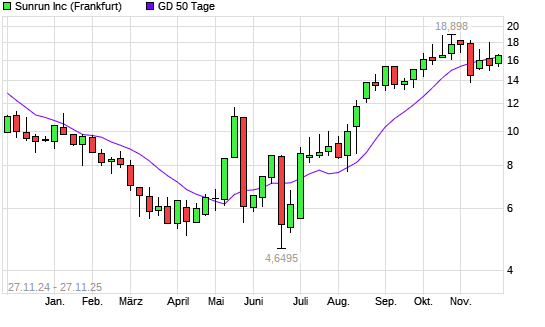 Mit dem Anstieg auf 16,62 EUR hat die Sunrun-Aktie am 26.11.2025 die 50-Tage-Linie nach oben gekreuzt.Die Sunrun-Aktie befindet sich seit dem 07.08.2025 im langfristigen Aufwärtstrend und hat ...weiterlesen