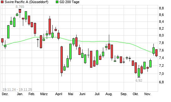 Mit dem Rücksetzer auf 7,36 EUR hat die Swire Pacific A-Aktie am 18.11.2025 die 200-Tage-Linie nach unten gekreuzt.Die Swire Pacific A-Aktie befand sich seit dem 11.11.2025 im langfristigen ...weiterlesen