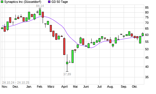 Mit dem Anstieg auf 60,40 EUR hat die Synaptics-Aktie am 24.10.2025 die 50-Tage-Linie nach oben gekreuzt.Die Synaptics-Aktie befindet sich seit dem 16.10.2025 im langfristigen Aufwärtstrend ...weiterlesen