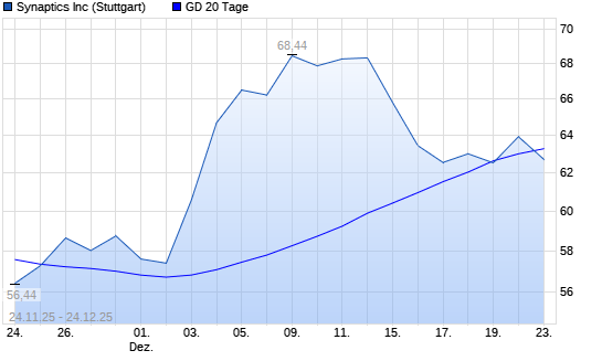 Mit dem Rücksetzer auf 62,68 EUR hat die Synaptics-Aktie am 23.12.2025 die 20-Tage-Linie nach unten gekreuzt.Die Synaptics-Aktie befindet sich seit dem 24.11.2025 im langfristigen Aufwärtstrend ...weiterlesen