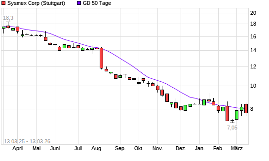 Mit dem Rücksetzer auf 7,60 EUR hat die Sysmex-Aktie am 12.03.2026 die 50-Tage-Linie nach unten gekreuzt.Die Sysmex-Aktie befindet sich seit dem 15.05.2025 im ...weiterlesen