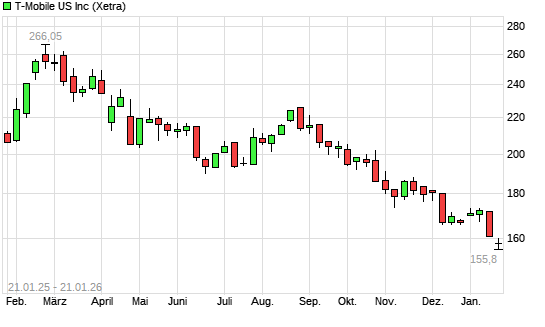Mit dem Rücksetzer auf 156,96 EUR hat die T-Mobile US-Aktie (ISIN US8725901040) am 20.01.2026 ein neues 12-Monats-Tief erreicht und damit den Kurs vom 19.01.2026 eingestellt.Die T-Mobile ...weiterlesen