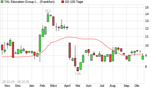 Mit dem Rücksetzer auf 8,95 EUR hat die TAL Education-Aktie am 17.10.2025 die 100-Tage-Linie nach unten gekreuzt.Die TAL Education-Aktie befindet sich seit dem 09.04.2025 im langfristigen ...weiterlesen
