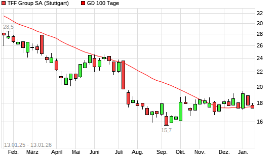 Mit dem Rücksetzer auf 17,65 EUR hat die TFF Group-Aktie am 12.01.2026 die 100-Tage-Linie nach unten gekreuzt.Die TFF Group-Aktie befindet sich seit dem 23.05.2024 im langfristigen Abwärtstrend ...weiterlesen