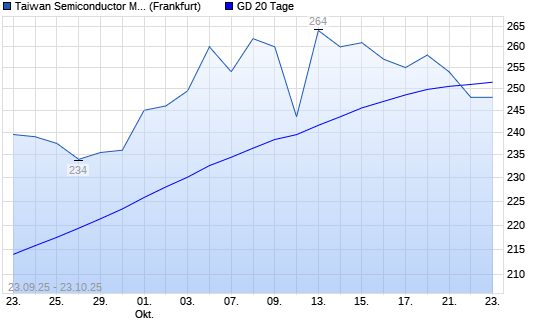 Mit dem Rücksetzer auf 248,00 EUR hat die TSMC-Aktie am 22.10.2025 die 20-Tage-Linie nach unten gekreuzt.Die TSMC-Aktie befindet sich seit dem 03.06.2025 im langfristigen Aufwärtstrend ...weiterlesen