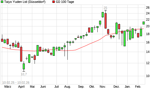 Mit dem Anstieg auf 20,80 EUR hat die Taiyo Yuden-Aktie am 09.02.2026 die 100-Tage-Linie nach oben gekreuzt.Die Taiyo Yuden-Aktie befindet sich seit dem 02.02.2026 im langfristigen Aufwärtstrend ...weiterlesen