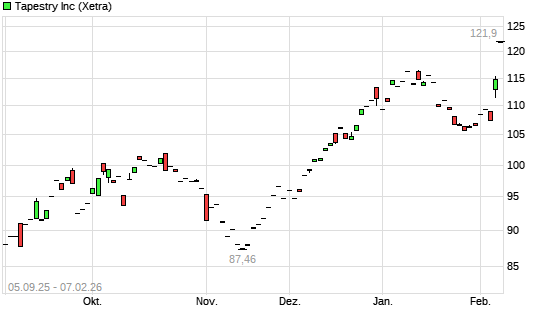Mit dem Anstieg auf 127,96 EUR hat die Tapestry-Aktie (ISIN US8760301072) am 06.02.2026 ein neues All-Time-High erreicht und damit den Kurs vom 05.02.2026 eingestellt.Die Tapestry-Aktie befindet ...weiterlesen