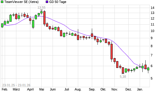 Mit dem Anstieg auf 5,85 EUR hat die TeamViewer-Aktie am 22.01.2026 die 50-Tage-Linie nach oben gekreuzt.Die TeamViewer-Aktie befindet sich seit dem 06.05.2025 im langfristigen Abwärtstrend ...weiterlesen
