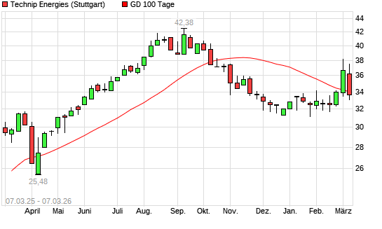 Mit dem Rücksetzer auf 33,42 EUR hat die Technip Energies-Aktie am 06.03.2026 die 100-Tage-Linie nach unten gekreuzt.Die Technip Energies-Aktie befindet sich seit dem 03.03.2026 ...weiterlesen