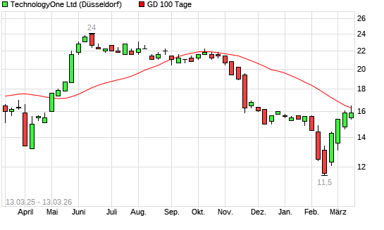 Mit dem Rücksetzer auf 15,90 EUR hat die Technology One-Aktie am 12.03.2026 die 100-Tage-Linie nach unten gekreuzt.Die Technology One-Aktie befindet sich seit dem 12.11.2025 ...weiterlesen