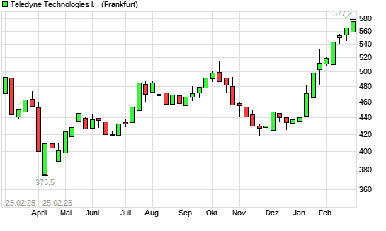Mit dem Anstieg auf 577,20 EUR hat die Teledyne Technologies-Aktie (ISIN US8793601050) am 24.02.2026 ein neues All-Time-High erreicht und damit den Kurs vom 23.02.2026 ...weiterlesen
