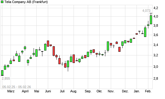 Mit dem Anstieg auf 4,07 EUR hat die Telia Company-Aktie (ISIN SE0000667925) am 04.02.2026 ein neues 5-Jahres-Hoch erreicht und damit den Kurs vom 03.02.2026 eingestellt.Die Telia Company-Aktie ...weiterlesen