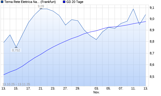 Mit dem Rücksetzer auf 8,95 EUR hat die Terna-Aktie am 12.11.2025 die 20-Tage-Linie nach unten gekreuzt.Die Terna-Aktie befindet sich seit dem 22.09.2025 im langfristigen Aufwärtstrend ...weiterlesen