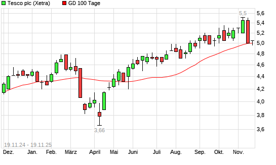 Mit dem Rücksetzer auf 4,92 EUR hat die Tesco-Aktie am 18.11.2025 die 100-Tage-Linie nach unten gekreuzt.Die Tesco-Aktie befindet sich seit dem 16.05.2025 im langfristigen Aufwärtstrend ...weiterlesen