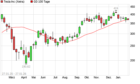 Mit dem Rücksetzer auf 366,00 EUR hat die Tesla-Aktie am 26.01.2026 die 100-Tage-Linie nach unten gekreuzt.Die Tesla-Aktie befindet sich seit dem 11.09.2025 im langfristigen Aufwärtstrend ...weiterlesen