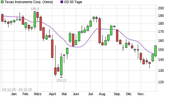Mit dem Anstieg auf 150,22 EUR hat die Texas Instruments-Aktie am 03.12.2025 die 50-Tage-Linie nach oben gekreuzt.Die Texas Instruments-Aktie befindet sich seit dem 04.09.2025 im langfristigen ...weiterlesen