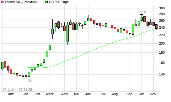 Mit dem Rücksetzer auf 235,00 EUR hat die Thales-Aktie am 06.11.2025 die 200-Tage-Linie nach unten gekreuzt.Die Thales-Aktie befand sich seit dem 21.01.2025 im langfristigen Abwärtstrend ...weiterlesen