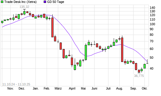 Mit dem Rücksetzer auf 45,04 EUR hat die The Trade Desk-Aktie am 10.10.2025 die 50-Tage-Linie nach unten gekreuzt.Die The Trade Desk-Aktie befindet sich seit dem 13.02.2025 im langfristigen ...weiterlesen