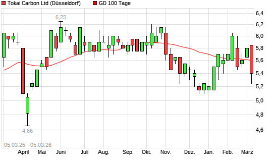 Mit dem Rücksetzer auf 5,35 EUR hat die Tokai Carbon-Aktie am 04.03.2026 die 100-Tage-Linie nach unten gekreuzt.Die Tokai Carbon-Aktie befindet sich seit dem 03.03.2026 ...weiterlesen