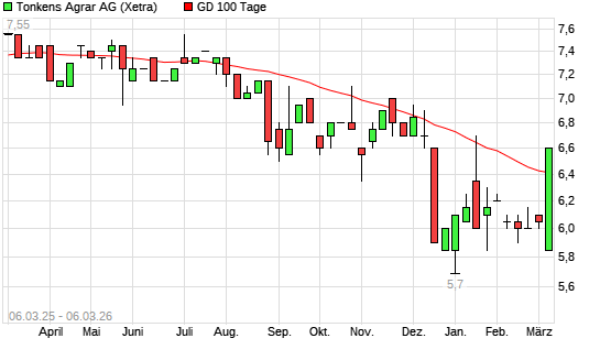 Mit dem Anstieg auf 6,60 EUR hat die Tonkens Agrar-Aktie am 05.03.2026 die 100-Tage-Linie nach oben gekreuzt.Die Tonkens Agrar-Aktie befindet sich seit dem 21.07.2025 im ...weiterlesen