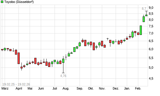 Mit dem Anstieg auf 8,75 EUR hat die Toyobo-Aktie (ISIN JP3619800000) am 18.02.2026 ein neues 3-Jahres-Hoch erreicht und damit den Kurs vom 17.02.2026 eingestellt.Die Toyobo-Aktie ...weiterlesen