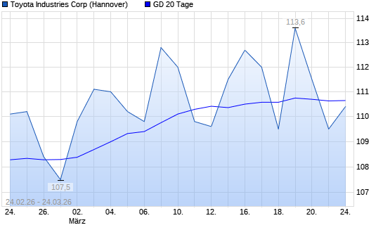 Mit dem Rücksetzer auf 109,40 EUR hat die Toyoda Automatic Loom Works-Aktie am 23.03.2026 die 20-Tage-Linie nach unten gekreuzt.Die Toyoda Automatic Loom Works-Aktie befindet ...weiterlesen
