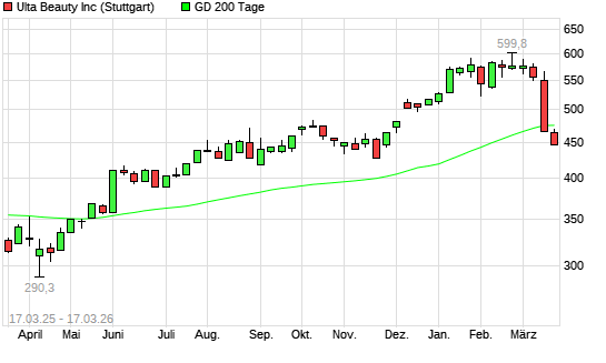 Mit dem Rücksetzer auf 465,60 EUR hat die Ulta Beauty-Aktie am 16.03.2026 die 200-Tage-Linie nach unten gekreuzt.Die Ulta Beauty-Aktie befand sich seit dem 12.05.2025 im ...weiterlesen