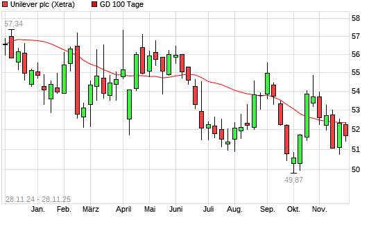 Mit dem Anstieg auf 52,70 EUR hat die Unilever-Aktie am 27.11.2025 die 100-Tage-Linie nach oben gekreuzt.Die Unilever-Aktie befindet sich seit dem 24.10.2025 im langfristigen Abwärtstrend und ...weiterlesen