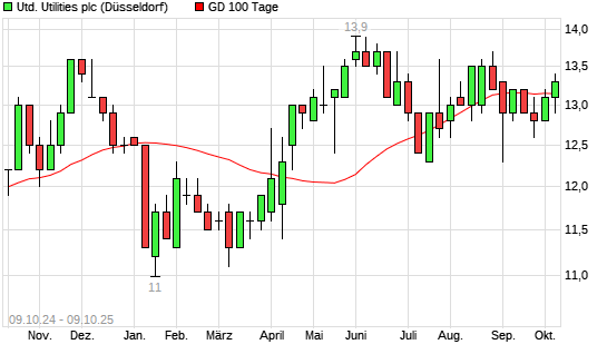 Mit dem Anstieg auf 13,30 EUR hat die United Utilities-Aktie am 08.10.2025 die 100-Tage-Linie nach oben gekreuzt.Die United Utilities-Aktie befindet sich seit dem 04.09.2025 im langfristigen ...weiterlesen