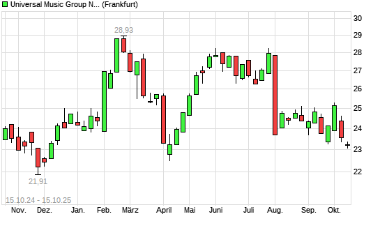 Mit dem Rücksetzer auf 23,23 EUR hat die Universal Music Group-Aktie (ISIN NL0015000IY2) am 14.10.2025 ein neues 6-Monats-Tief erreicht und damit den Kurs vom 13.10.2025 eingestellt.Die ...weiterlesen