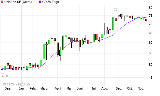 Mit dem Rücksetzer auf 72,50 EUR hat die Uzin Utz-Aktie am 12.11.2025 die 50-Tage-Linie nach unten gekreuzt.Die Uzin Utz-Aktie befindet sich seit dem 04.02.2025 im langfristigen Aufwärtstrend ...weiterlesen