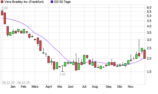 Mit dem Anstieg auf 2,30 EUR hat die VERA BRADLEY-Aktie (ISIN US92335C1062) am 13.11.2025 ein neues 6-Monats-Hoch erreicht und damit den Kurs vom 10.06.2025 eingestellt.Die VERA BRADLEY-Aktie ...weiterlesen