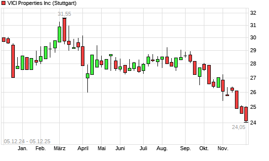 Mit dem Rücksetzer auf 24,14 EUR hat die VICI Properties-Aktie (ISIN US9256521090) am 04.12.2025 ein neues 3-Jahres-Tief erreicht und damit den Kurs vom 02.12.2025 eingestellt.Die VICI ...weiterlesen
