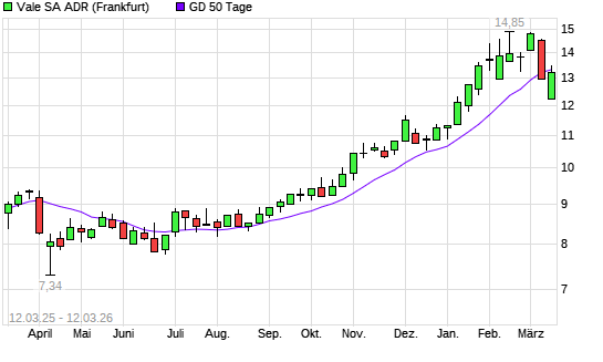 Mit dem Rücksetzer auf 13,20 EUR hat die Vale ADR-Aktie am 11.03.2026 die 50-Tage-Linie nach unten gekreuzt.Die Vale ADR-Aktie befindet sich seit dem 25.08.2025 im ...weiterlesen