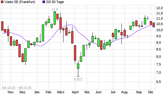 Mit dem Rücksetzer auf 10,34 EUR hat die Valeo-Aktie am 08.10.2025 die 50-Tage-Linie nach unten gekreuzt.Die Valeo-Aktie befindet sich seit dem 08.07.2025 im langfristigen Aufwärtstrend ...weiterlesen