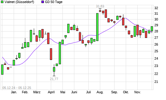 Mit dem Anstieg auf 28,40 EUR hat die Valmet-Aktie am 04.12.2025 die 50-Tage-Linie nach oben gekreuzt.Die Valmet-Aktie befindet sich seit dem 26.11.2025 im langfristigen Aufwärtstrend und hat ...weiterlesen
