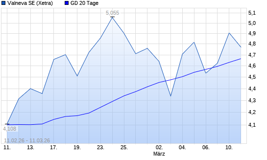 Mit dem Anstieg auf 4,85 EUR hat die Valneva-Aktie am 10.03.2026 die 20-Tage-Linie nach oben gekreuzt.Die Valneva-Aktie befindet sich seit dem 23.07.2025 im langfristigen Aufwärtstrend ...weiterlesen