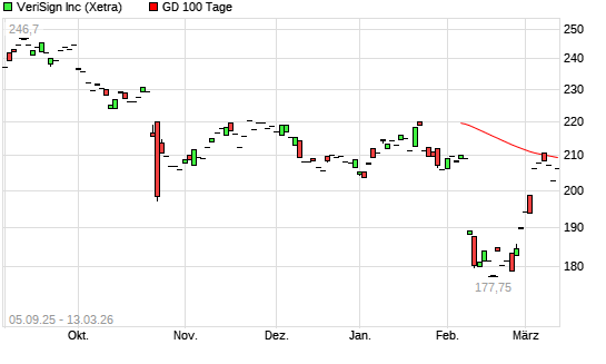 Mit dem Anstieg auf 207,60 EUR hat die Verisign-Aktie am 12.03.2026 die 100-Tage-Linie nach oben gekreuzt.Die Verisign-Aktie befindet sich seit dem 09.10.2025 im langfristigen ...weiterlesen