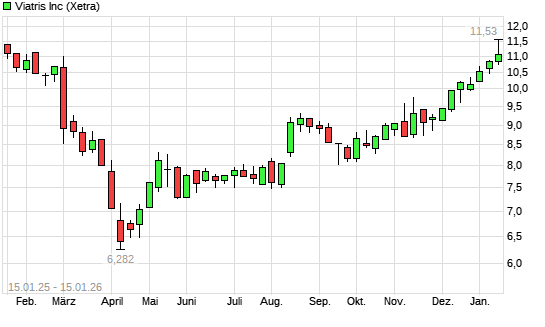 Mit dem Anstieg auf 11,31 EUR hat die Viatris-Aktie (ISIN US92556V1061) am 14.01.2026 ein neues 6-Monats-Hoch erreicht und damit den Kurs vom 13.01.2026 eingestellt.Die Viatris-Aktie befindet ...weiterlesen