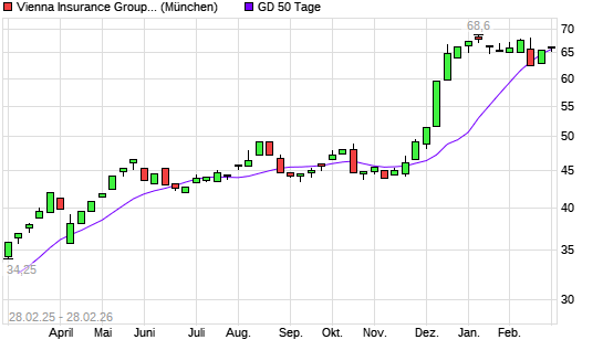Mit dem Anstieg auf 66,00 EUR hat die Vienna Insurance-Aktie am 27.02.2026 die 50-Tage-Linie nach oben gekreuzt.Die Vienna Insurance-Aktie befindet sich seit dem 13.12.2024 ...weiterlesen