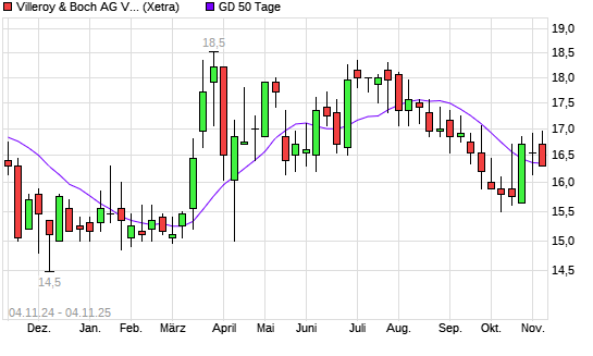 Mit dem Rücksetzer auf 16,30 EUR hat die Villeroy & Boch Vz-Aktie am 03.11.2025 die 50-Tage-Linie nach unten gekreuzt.Die Villeroy & Boch Vz-Aktie befindet sich seit dem 28.10.2025 ...weiterlesen