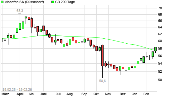 Mit dem Anstieg auf 58,20 EUR hat die Viscofan-Aktie am 18.02.2026 die 200-Tage-Linie nach oben gekreuzt.Die Viscofan-Aktie befand sich seit dem 12.02.2026 im langfristigen ...weiterlesen