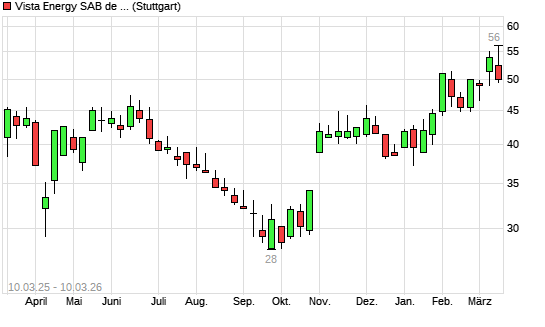 Mit dem Anstieg auf 55,00 EUR hat die Vista Oil & Gas SAB de CV-Aktie (ISIN US92837L1098) am 09.03.2026 ein neues 12-Monats-Hoch erreicht und damit den Kurs vom 03.03.2026 ...weiterlesen