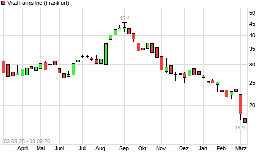 Mit dem Rücksetzer auf 17,10 EUR hat die Vital Farms-Aktie (ISIN US92847W1036) am 02.03.2026 ein neues 12-Monats-Tief erreicht und damit den Kurs vom 27.02.2026 eingestellt.Die ...weiterlesen