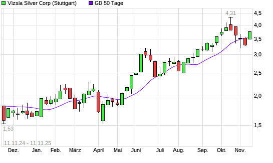 Mit dem Anstieg auf 3,68 EUR hat die Vizsla Silver-Aktie am 10.11.2025 die 50-Tage-Linie nach oben gekreuzt.Die Vizsla Silver-Aktie befindet sich seit dem 06.05.2025 im langfristigen Aufwärtstrend ...weiterlesen