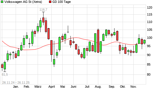 Mit dem Anstieg auf 97,60 EUR hat die Volkswagen St-Aktie am 25.11.2025 die 100-Tage-Linie nach oben gekreuzt.Die Volkswagen St-Aktie befindet sich seit dem 24.11.2025 im langfristigen Abwärtstrend ...weiterlesen