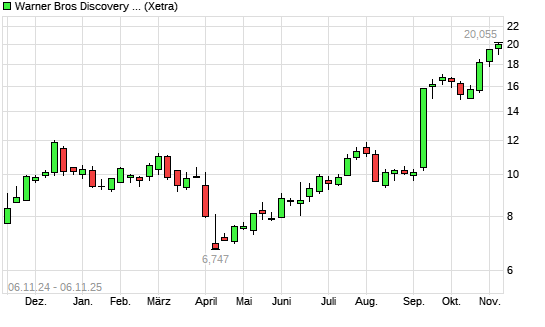 Mit dem Anstieg auf 20,00 EUR hat die Warner Bros Discovery-Aktie (ISIN US9344231041) am 05.11.2025 ein neues 3-Jahres-Hoch erreicht und damit den Kurs vom 03.11.2025 eingestellt.Die Warner ...weiterlesen
