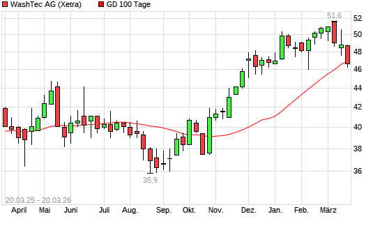 Mit dem Rücksetzer auf 46,90 EUR hat die WashTec-Aktie am 19.03.2026 die 100-Tage-Linie nach unten gekreuzt.Die WashTec-Aktie befindet sich seit dem 23.10.2025 im ...weiterlesen